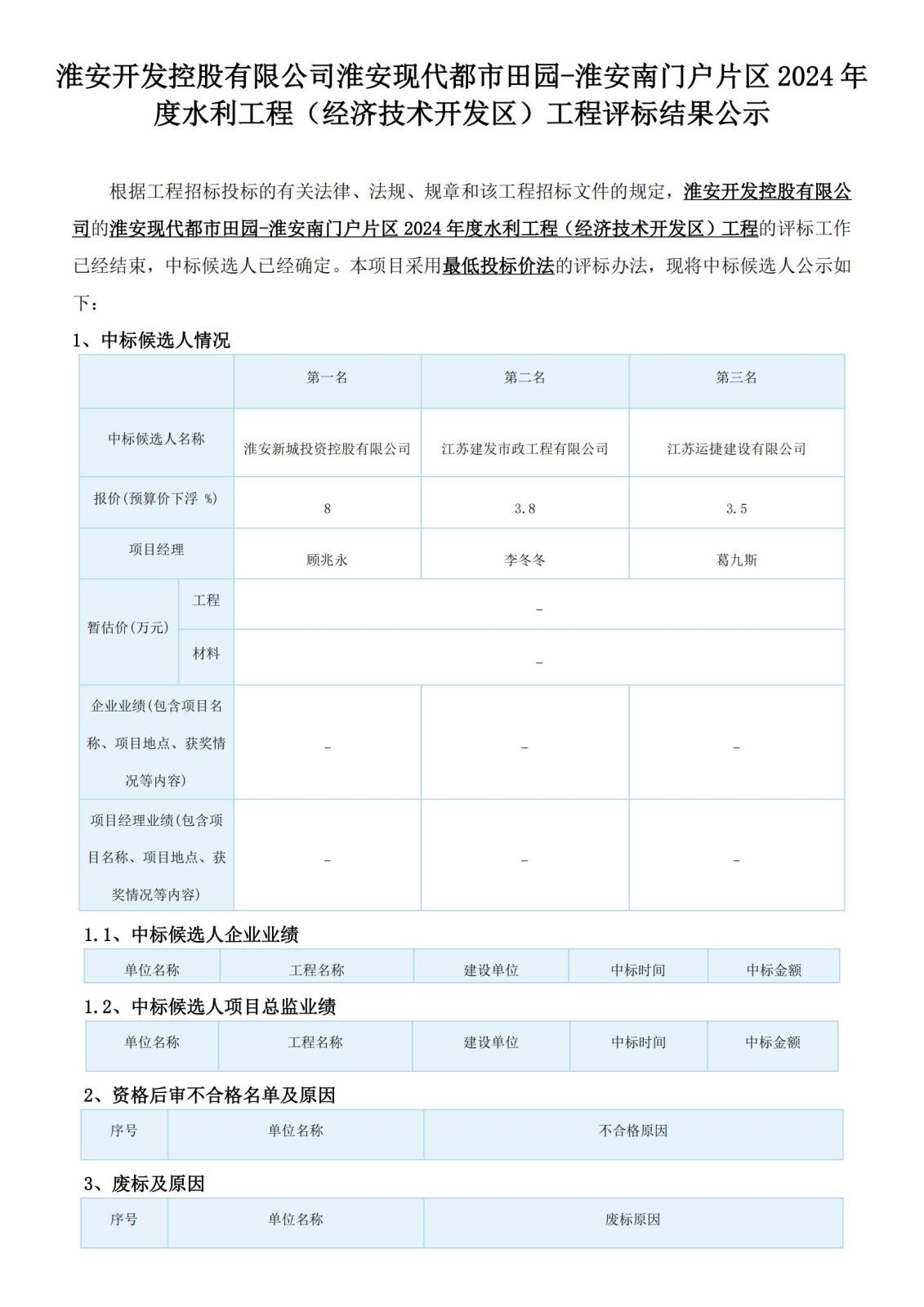 淮安开发控股有限公司淮安现代都市田园-淮安南门户片区2024年度水利工程(经济技术开发区)工程评标结果公示