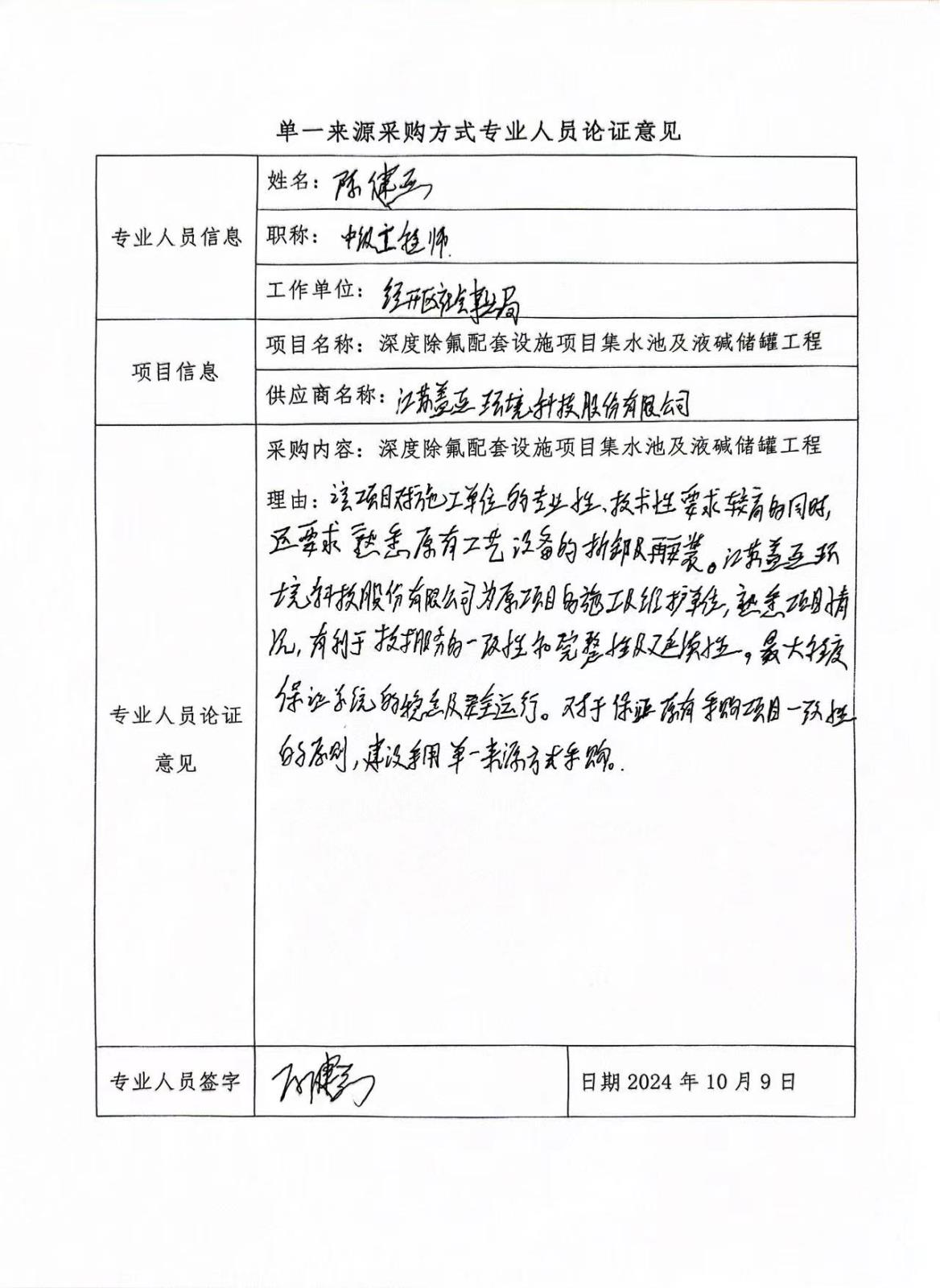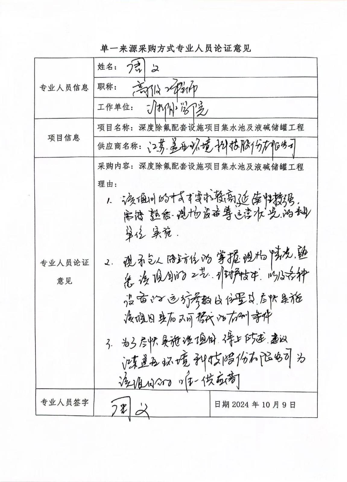 一、项目信息 采 购 人:淮安港淮建设发展有限公司 项目名称:深度除氟配套设施项目集水池及液碱储罐工程 拟采购的货物或服务的说明:深度除氟配套设施项目集水池及液碱储罐工程 拟采购标的预算金额:213万元 采用单一来源采购方式的原因及说明:本项目是深度除氟配套设施项目集水池及液碱储罐工程,为深度除氟配套设施项目配套项目,建设深度除氟分别需要满足原有的0.8万m3/d、1.5万m3/d、1.5万m3/d、0.1万m3/d设计要求,设计集水池需要完全配合原有的“混凝沉淀+树脂吸附”处理工艺,并且要求经处理后废水氟化物浓度≤1.5mg/L,本项目为降低水资源及周边环境污染,对施工单位的专业性、技术性同时对原有工艺设备的拆卸再安装要求较高;江苏盖亚环境科技股份有限公司为该项目的总承包单位,对该项目有丰富的维护经验,熟悉原有设备的运行参数及安装位置条件,对再次安装可以较为精准把控,能满足招标人对工程质量、服务响应速度的要求。江苏盖亚环境科技股份有限公司施工有利于保持技术服务的一致性和业务功能的延续性,特别是在数据安全性可以得到最大程度的安全保障,可以最大程度降低系统运行风险,保证系统运行效率和稳定。故本项目由江苏盖亚环境科技股份有限公司负责实施,具有唯一性和不可替代性。 根据法律法规规定,使用不可替代的专利,专有技术,或者公共服务项目具有特殊要求,导致只能从某一特定供应商处采购。故本项目采用单一来源方式采购。 二、拟定供应商信息 名称:江苏盖亚环境科技股份有限公司 地址:苏州工业园区唯正路8号唯亭科技创业大厦7楼701-724室 统一社会信用代码:91320594050291184M 三、公示期限 2024年10月10日至2024年10月12日,任何投标人、单位或个人对采用单一来源采购方式公示有异议的,请于2024年10月12日17:30前以书面形式向招标人反映。 四、专业人员对相关供应商因专利、专有技术等原因具有唯一性的具体论证意见: 根据法律法规规定,该项目符合《中华人民共和国政府采购法》第三十一条 第一、三款所述情况,“只能从唯一供应商处采购的”,“必须保证原有采购项目一致性或者服务配套的要求,需要继续从原供应商处添购。为有效保障深度除氟配套设施污水、污泥设备的稳定运行及无缝对接,故使用单一来源采购方式。 五、联系方式 1.招 标 人:淮安港淮建设发展有限公司 联 系 人:郭工 联系地址:淮安经济技术开发区富誉路3号 联系电话:13952343888 2.代理机构 名 称:宏信天德工程顾问有限公司 联系地址:淮安经济技术开发区宏恒胜路11号 联 系 人:沈靖 联系电话:18762085577 六、附件 专业人员论证意见(见附件) 采 购 人:淮安港淮建设发展有限公司 日 期:2024年10月10日