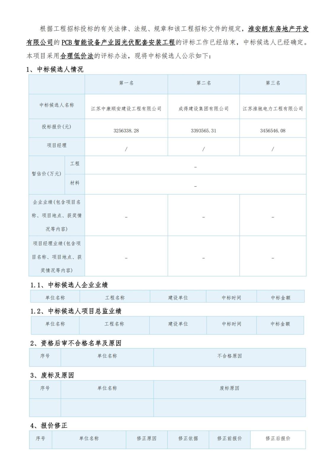 淮安朗东房地产开发有限公司PCB智能设备产业园光伏配套安装工程评标结果公示