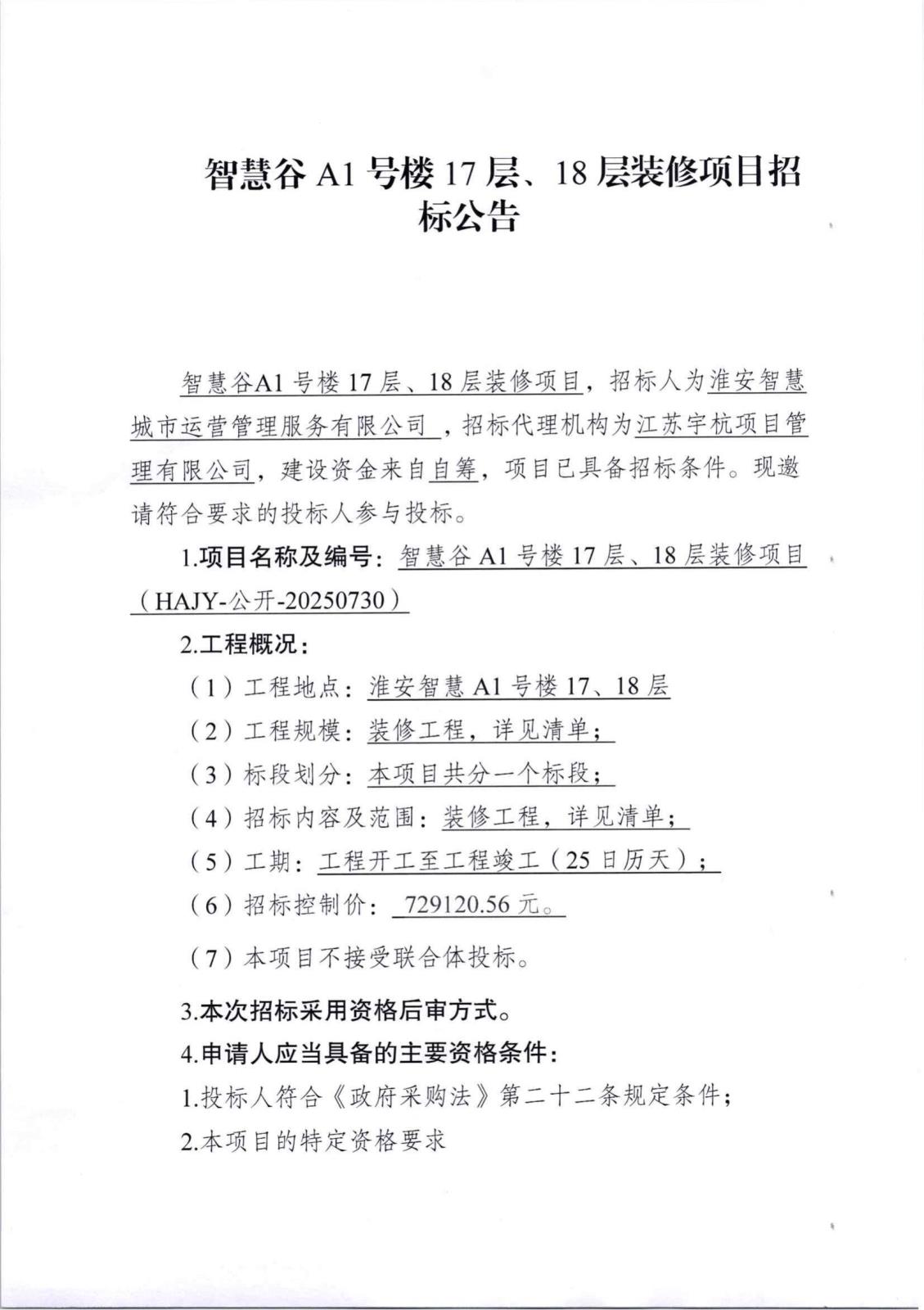 智慧谷A1号楼17层、18层楼装修项目招标公告